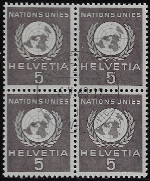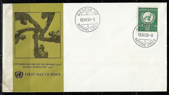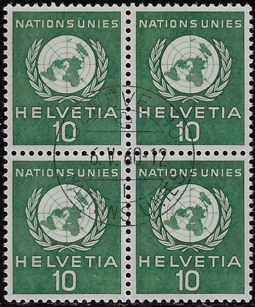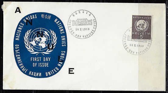 Für das Europäische Amt der Vereinten Nationen. Gedenkmarke 10 Jahre Vereinte Nationen. Ersttagsgestempelt 24.10.1959