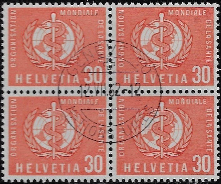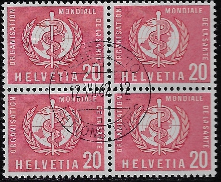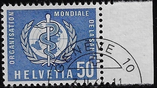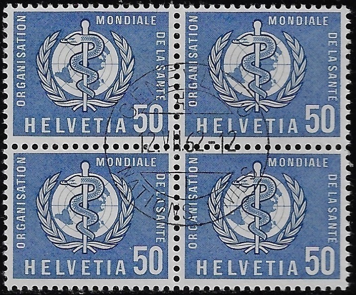 Für die Weltgesundheitsorganisationen, Symbolische Darstellung, Farbänderung und Ergänzungswerte, UNO Symbol und Äskulab - Stab, mit Aufdruck: “Organisation mondiale de la santé“