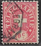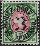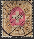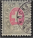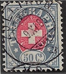 Papier: Faserpapier mit eingepresstem Kontrollzeichen, blau und rot gefasert