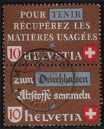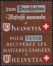 Sondermarke für die Altstoffverwertung Durchhalten / Tenir. Senkrecht zusammenhängendes Paar in zwei Sprachen.